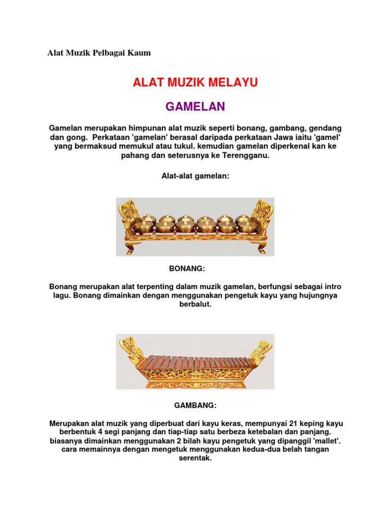 Gamelangamelan adalah ensembel musik yang biasanya menonjolkan metalofon, gambang, gendang, dan gong. Gamelan is one of the traditional music from indonesia. Sarune kale berasal dari nanggroe aceh darussalam yang mempunyai jenis gendang melayu berasal dari kepulauan bangka belitung yang mempunyai jenis bunyi membranofon, yaitu gamelan berasal dari jawa tengah yang mempunyai jenis bunyi ideofon. Sebenarnya tidak tahu persis berapa jumlah alat musik daerah riau ini, bisa jadi. Gamelan is one of the traditional music from indonesia.