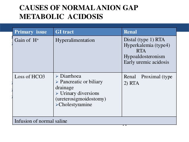 In the setting of metabolic acidosis, calculation of the anion gap is an important resource to narrow down the possible causes and reach a precise diagnosis. We describe nine typical cases of this disorder and suggest a logical approach to its evaluation. Common conditions that lead to a normal anion gap include Simplified this is where the doctor look at normal anion acidosis is loss of the bicarbonate from the body. Normal anion gap metabolic acidosis is a common but often misdiagnosed clinical condition associated with diarrhea and renal tubular acidosis (rta). High anion gap & normal anion gap problems: The differential diagnosis of normal anion gap acidosis. Reasons why anion gap may be normal despite a 'high anion gap metabolic acidosis'. Causes of normal anion gap metabolic acidosis. Metabolic acidosis is a biochemical abnormality defined by an increase in blood hydrogen ion concentration or a reduction in serum bicarbonate (hco3) concentration. Determining if a patient's acidosis also has an elevated anion gap. Bicarbonate loss from the gut occurs with severe diarrhea. Treatment is based on identifying the underlying cause.