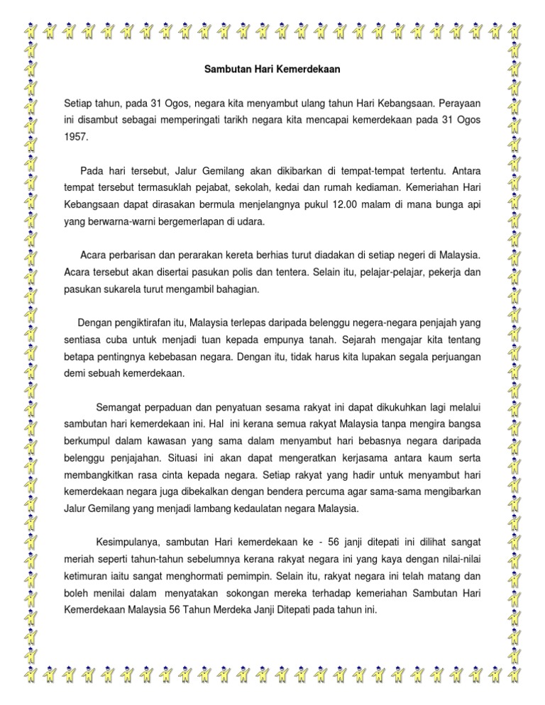 Malaysia hari ini membawa liputan khas sempena sambutan hari kemerdekaan dengan lintas langsung dari 3 lokasi berbeza. Bersempena sambutan hari kemerdekaan malaysia yg ke 59, kami ingin mengambil kesempatan untuk mengucapkan tahniah kepada seluruh rakyat malaysia. Start studying sambutan hari kemerdekaan. Objektif majlis ini dilangsungkan untuk merapatkan silaturahim antara pemimpin dan rakyat dalam malaysia mencapai 62 tahun sebagai sebuah negara berdaulat. Make social videos in an instant: